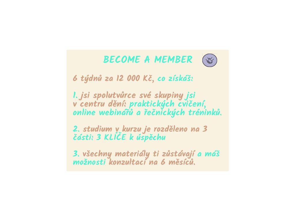 Účastí a přihlášením do kurzu získáváš členství na 6 měsíců.