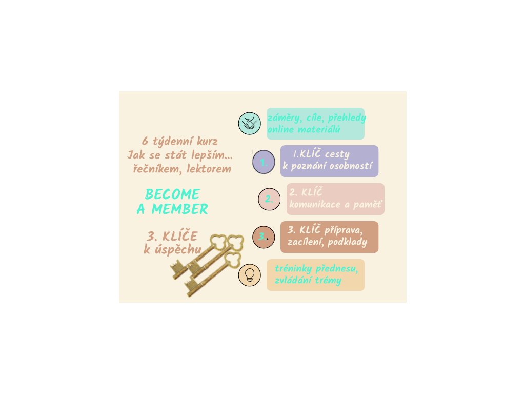 6 týdenní kurz praktických řečnických i lektorksých dovedností, rozdělen do 3 částí, 3 KLÍČŮ k poznání.